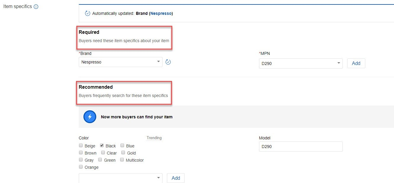 - Required: item specifics that are critical to the buyer experience, eBay require these for new, relisted and revised listings