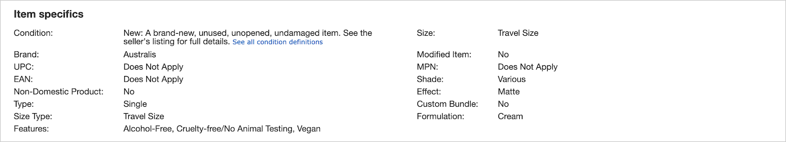 Actually one of the most important factors of any eBay listing, item specifics are basically details about the product you are selling and they appear as an easy to read breakdown above your description.