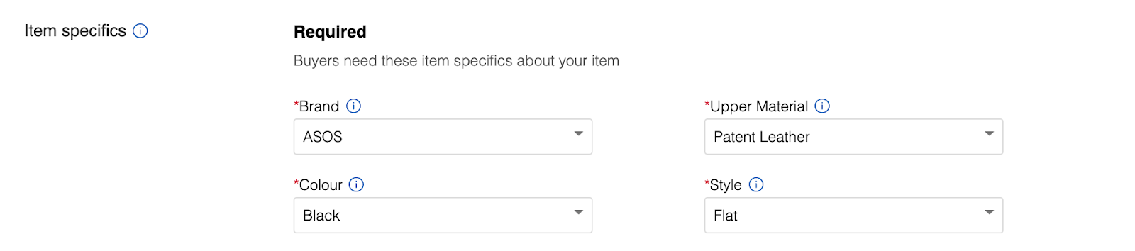 - In the item specifics section of the sell your item form, enter the required fields for your product. In this example, we are selling a pair of shoes and the required specifics include brand, colour, upper material and style. You select from a range of options on the drop-down list or simply add your own.